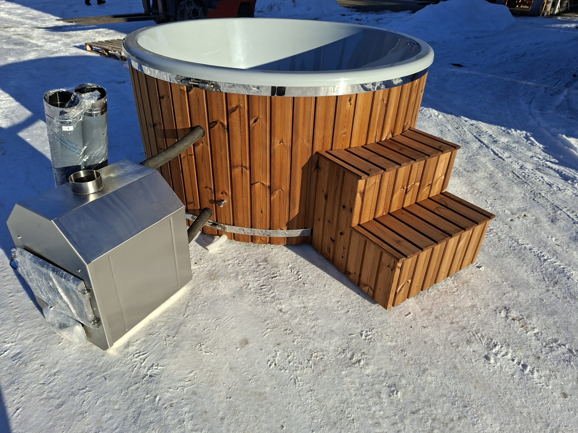 Alapfelszerelés: - üvegszálas kád - integrált kályha Aisi 304 rozsdamentes acélból,rozsdamentes föstcsővel- 32kw - lucfenyő boritás - fából készült létra - 2 rozsdamentes acél abroncs - Kapacitás 6-7 fő + 2 gyerek - 1490 L térfogat - Fűtési idő 2-3 óra integrált fatüzelésű kályhával - Külső átmérő 2,25 m - Belső átmérő 2,04m - Magasság 1,06 m - Súly 210kg - Hidromasszázs rendszer 8 fúvóka - habszigetelés - betét:szürke,fehér,vagy kék - felületkezelést az ár tartalmazza. (szinskála apaján) - fa italtartó 1db - Szigetelt fedél - led világítás 1 db , 7 külömboző szin . - leeresztő csap - vizhőmérő
